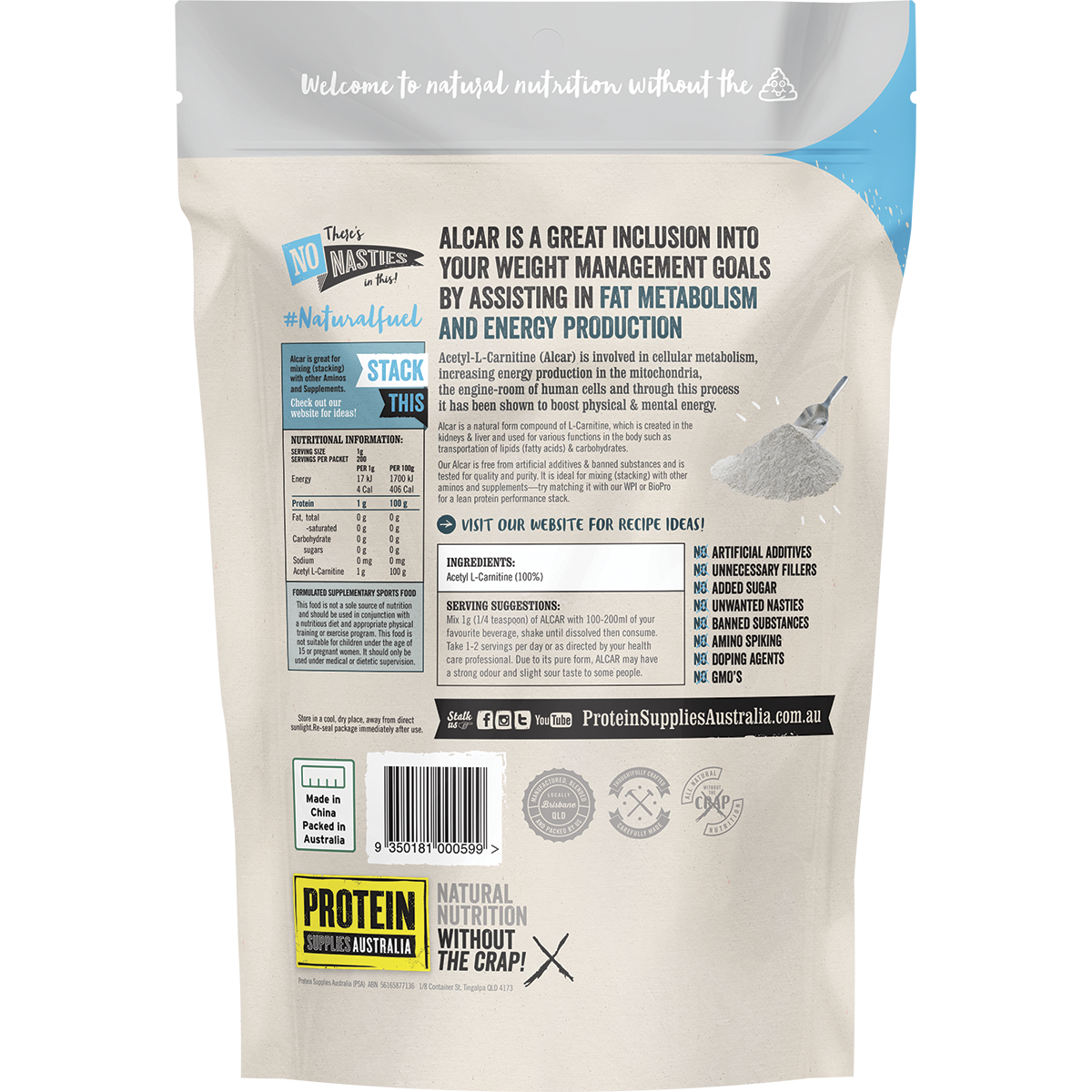 Protein Supplies Australia's commitment to quality ensures that you're getting a product that's not only effective but also easy to incorporate into your daily routine. Say goodbye to unnecessary complexity and embrace a straightforward approach to wellness with Alcar Acetyl L-Carnitine Pure.