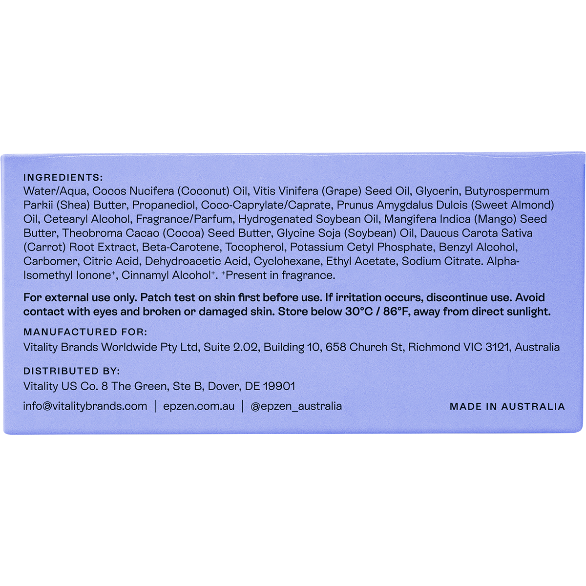 Crafted with a harmonious blend of natural ingredients, Epzen Body Butter combines the goodness of coconut oil, shea butter, and mango seed butter to provide your skin with lasting moisture. Each application envelops your body in a silky layer of hydration, while the sweet almond and grape seed oils deliver essential nutrients to keep your skin looking its best. The subtle notes of chocolate and tropical coconut will transport your senses to a serene paradise, making every use an indulgent escape.