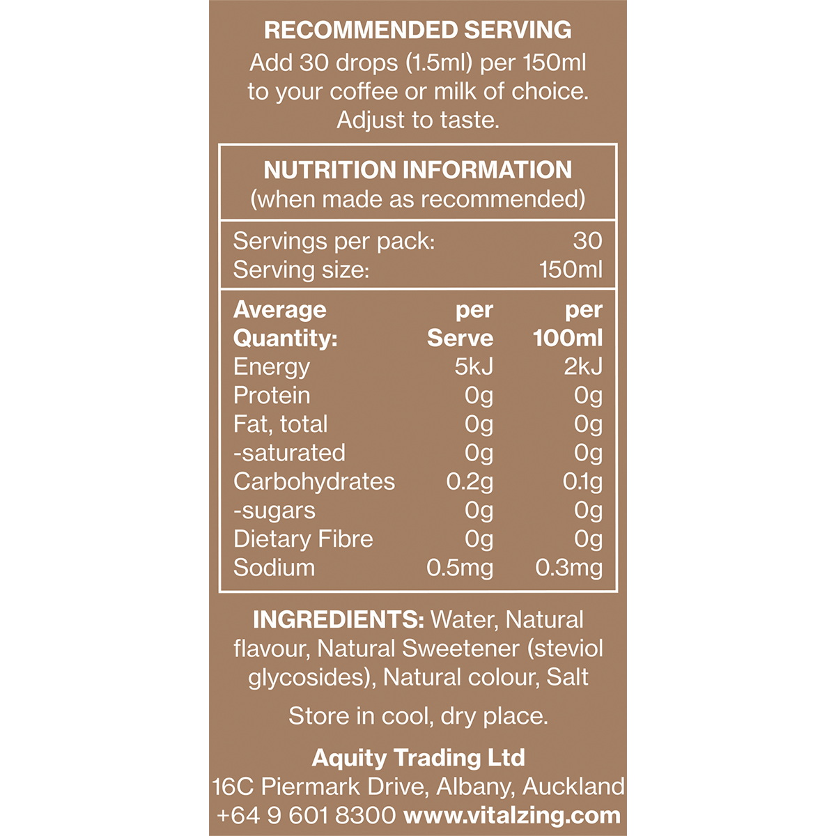 Discover the delightful taste of Vital Zing Cafe Drops in Hazelnut, your new go-to for elevating beverages and snacks with a touch of gourmet flavour. Designed for flavour enthusiasts and health-conscious individuals alike, these drops offer a rich hazelnut essence that transforms your everyday drinks and dishes into extraordinary experiences. Whether you're enhancing your morning coffee, sweetening up a smoothie, or adding depth to your favourite desserts, these drops deliver a deliciously satisfying taste without compromising on quality.