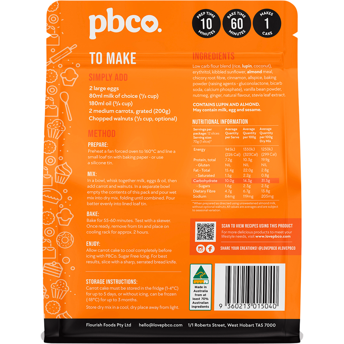 Crafted with a thoughtful selection of plant-based ingredients, PBco Carrot Cake Mix combines the wholesome goodness of low carb flour blends, almond meal, and kibbled sunflower to create a moist and flavourful cake. Infused with aromatic spices like cinnamon, nutmeg, and ginger, this mix delivers a delightful taste experience that evokes warmth and nostalgia. Plus, the inclusion of natural sweeteners like erythritol and stevia ensures that you can enjoy your cake without the added sugar.