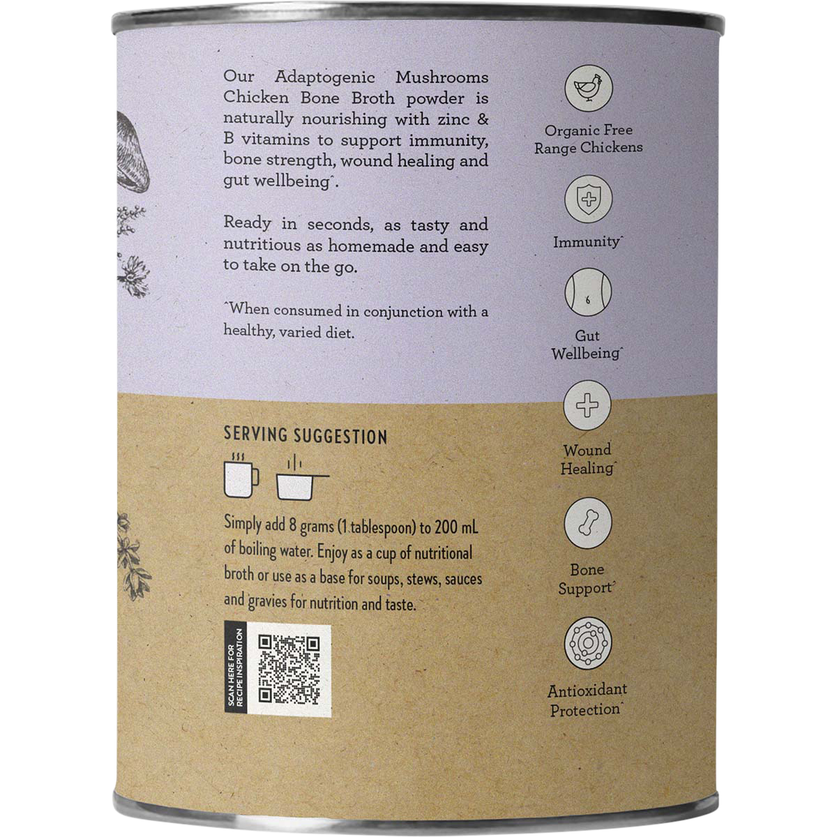Why choose our Chicken Bone Broth Adaptogenic Mushrooms? With 78% organic free-range chicken bone broth, this product is a delightful fusion of flavours, providing you with a satisfying and warming beverage or base for your favourite recipes. The inclusion of shiitake and maitake mushrooms not only enhances the taste but also contributes to your overall wellness routine, making it a perfect companion for those looking to support their health naturally.