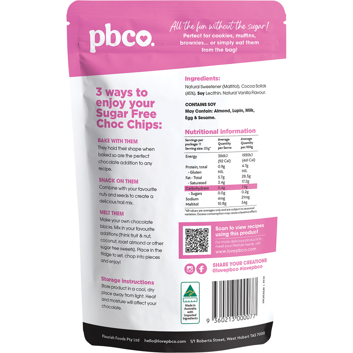 PBco Chocolate Chips are sweetened with a natural maltitol sweetener, ensuring a delightful taste that doesn’t compromise on flavour. The blend of cocoa solids and natural vanilla flavour creates a rich and aromatic experience, making these chips an excellent addition to your pantry. They’re perfect for baking cookies, adding to granola, or simply enjoying by the handful. With a focus on clean ingredients and a commitment to quality, PBco delivers a product you can trust to support your healthy eating habits.