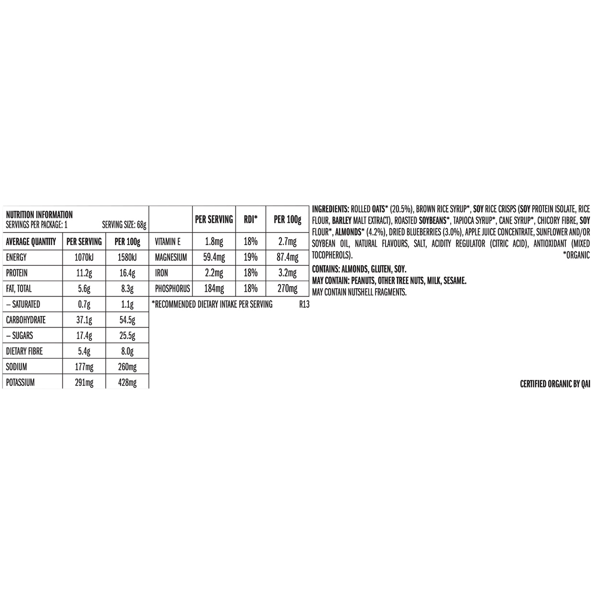 Wholesome Ingredients: Contains Organic Rolled Oats, Organic Roasted Soybeans, Almonds, and Soy Rice Crisps.