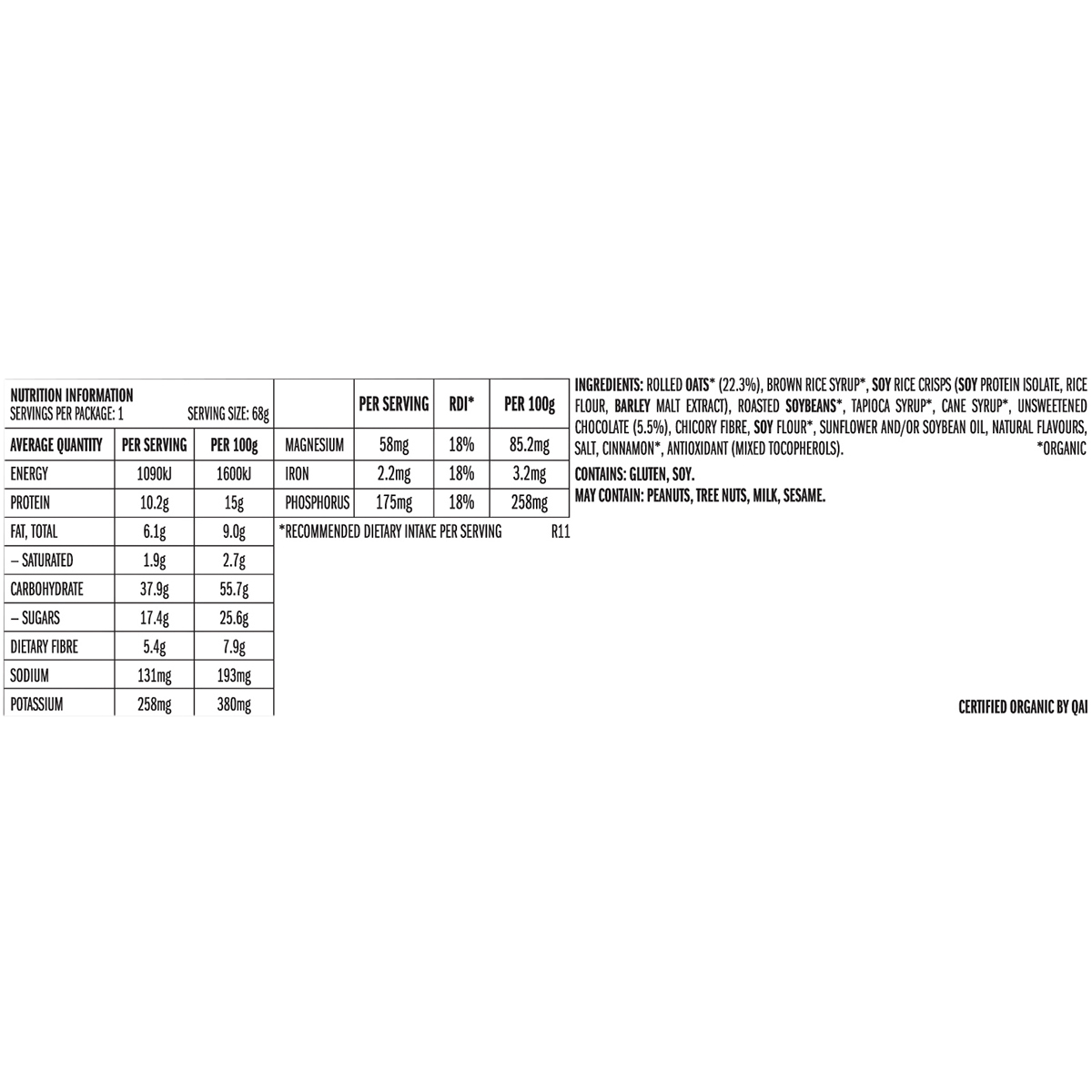 Organic Certified: Made primarily with Organic Rolled Oats (22.3%) and Organic Brown Rice Syrup.