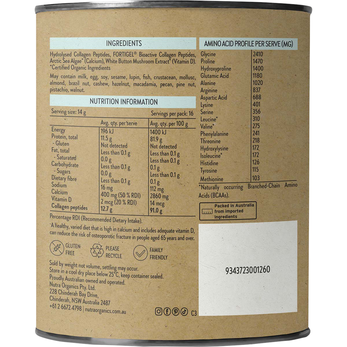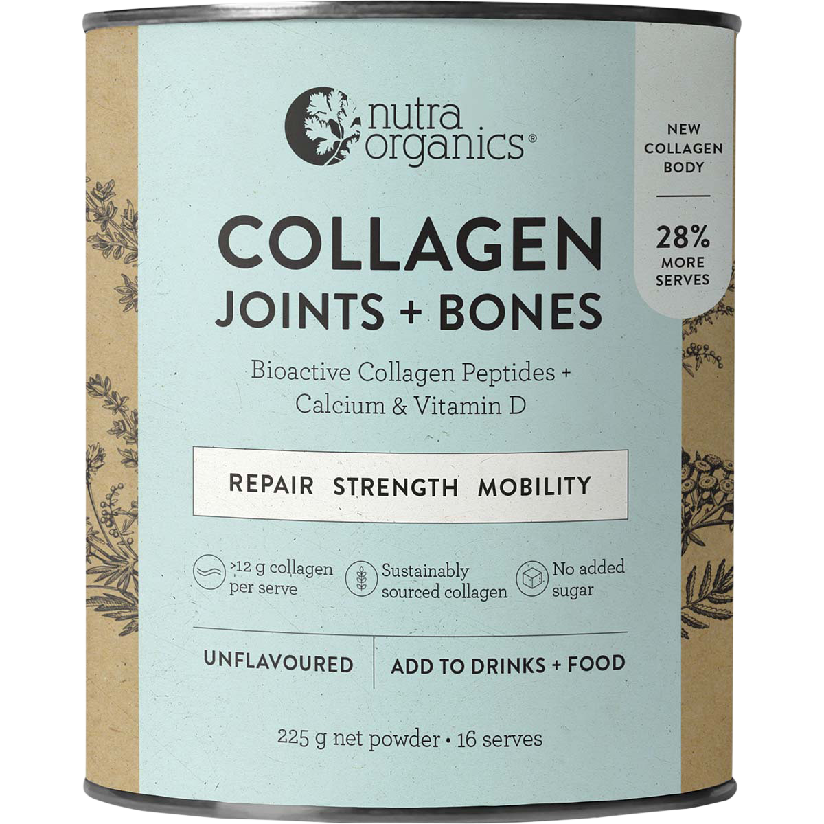 Crafted with your health in mind, Nutra Organics Collagen Joints + Bones features a unique formulation that combines the power of Fortigel® bioactive collagen peptides with the goodness of Arctic Sea Algae and White Button Mushroom Extract. This delicious blend provides a rich source of plant-based protein, ensuring that you’re nourishing your body with the best nature has to offer. Enjoy the subtle cocoa notes in every serving, making it an indulgent addition to your daily routine without compromising on health.