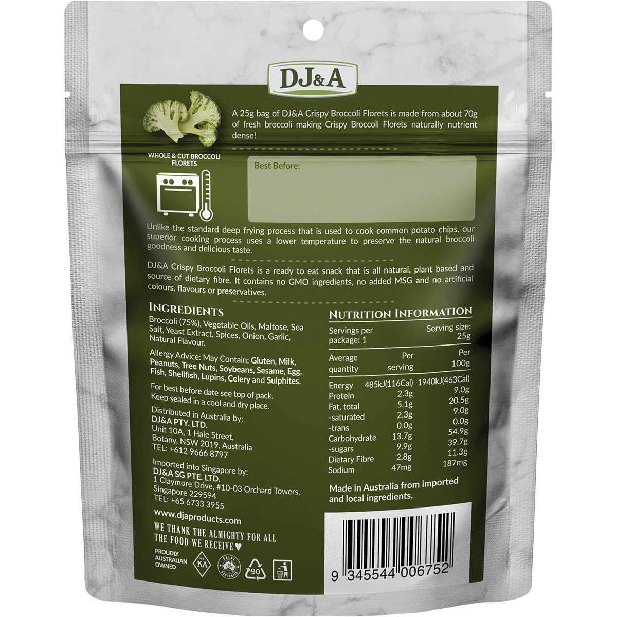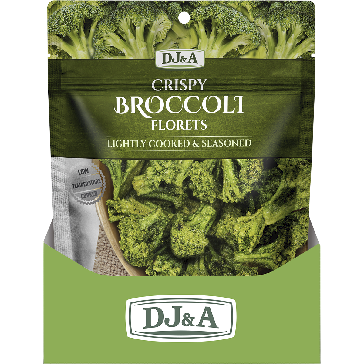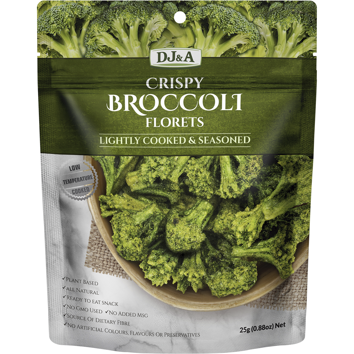 Unlike traditional deep-fried alternatives, DJ&A uses a unique process to achieve maximum crispness while preserving the natural goodness of the broccoli. Each floret is lightly seasoned with a savoury blend of Sea Salt, Yeast Extract, Spices, Onion, and Garlic, providing a satisfying umami flavor.