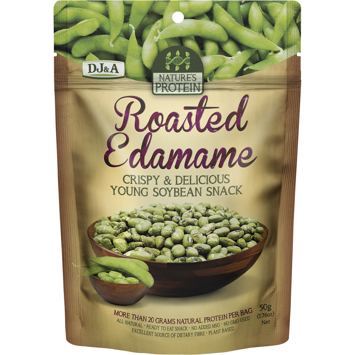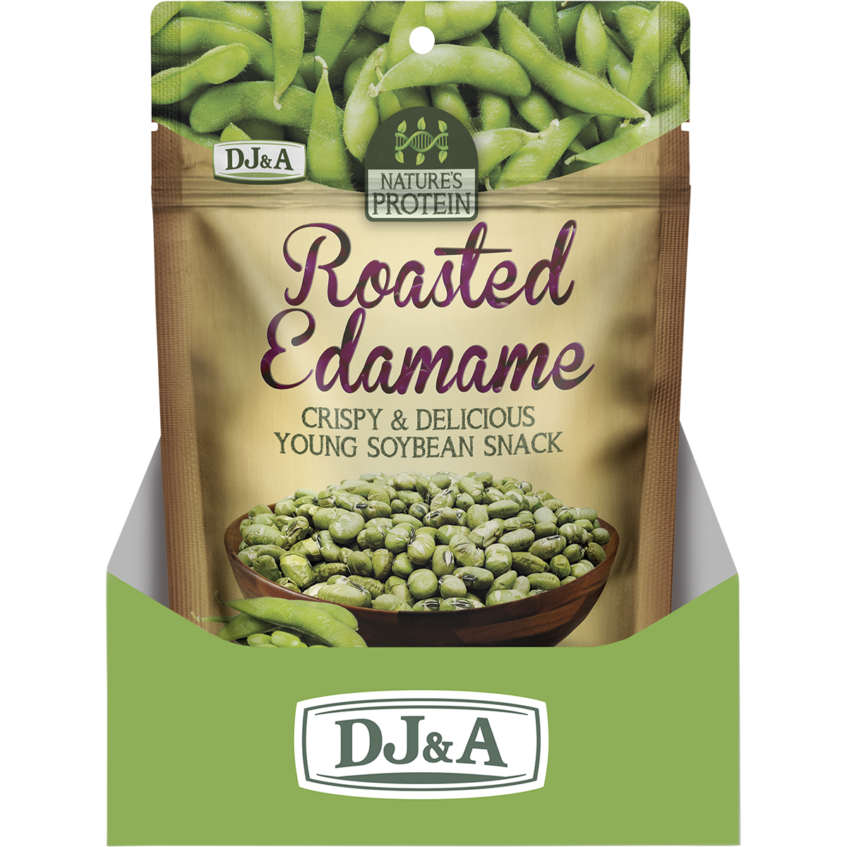 Enjoy DJ&A Nature's Protein Roasted Edamame—a delicious, savory, and guilt-free alternative to traditional chips and processed snacks.