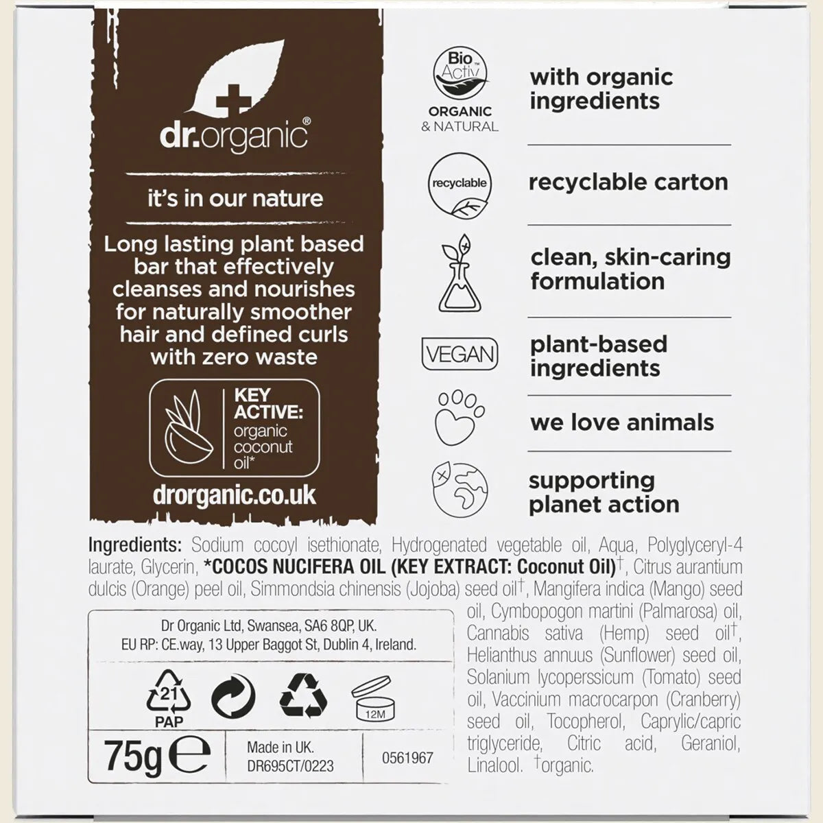 Dr. Organic Shampoo & Conditioner Bar Coconut Orange Curly & Thick 75g