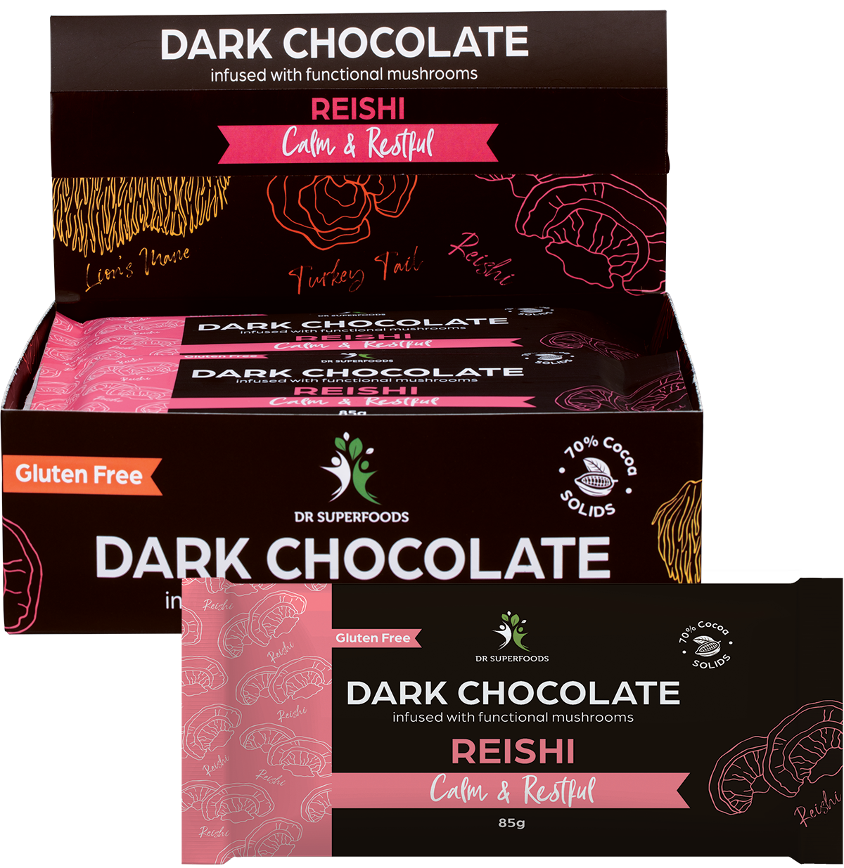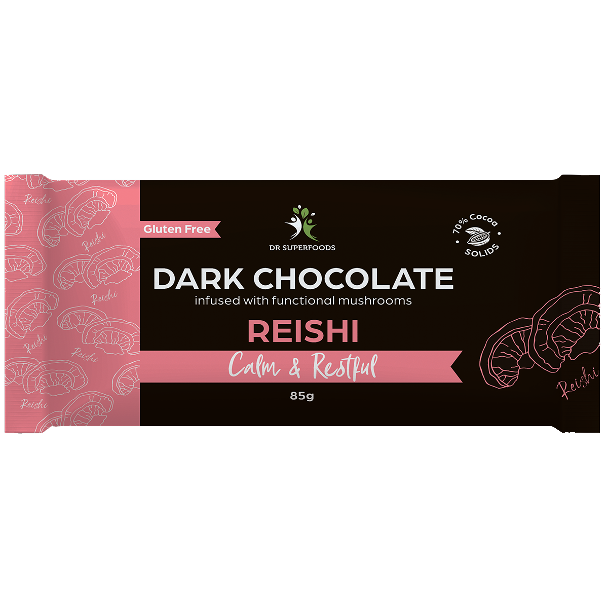 Indulge in tranquility with the Dr Superfoods Dark Chocolate Bar, expertly crafted to support calm and restful moments. Each luxurious 85g bar combines the intense, rich flavour of premium dark chocolate (69.5% cocoa mass) with the balancing power of Reishi mushroom extract.