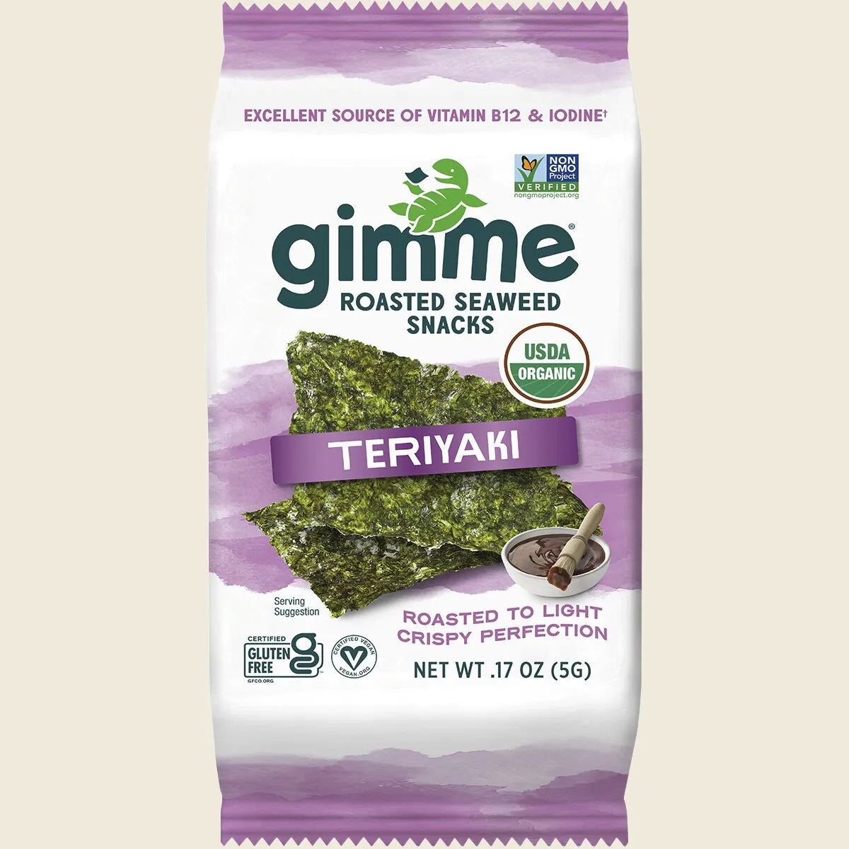 Savor the bold flavor of Gimme Roasted Seaweed Snacks Teriyaki. Made from organic seaweed and roasted with organic sesame and sunflower oils, these crispy sheets are coated in a savory teriyaki seasoning for the perfect umami crunch.