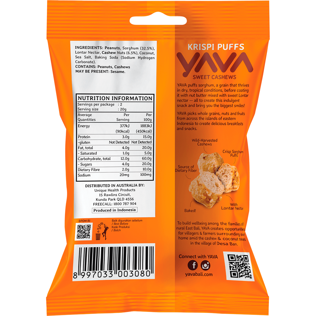 Made from a nourishing combination of plant-based ingredients, YAVA Krispi Puffs Sweet Cashews are not just about satisfying your cravings; they're about embracing a lifestyle filled with clean, organic goodness. The unique blend features sorghum and peanuts, offering a burst of plant protein, while the subtle sweetness of lontar nectar and a hint of sea salt create a perfectly balanced flavour profile. Enjoy the rich, nutty goodness of cashews and the tropical touch of coconut, making every bite a flavourful experience.