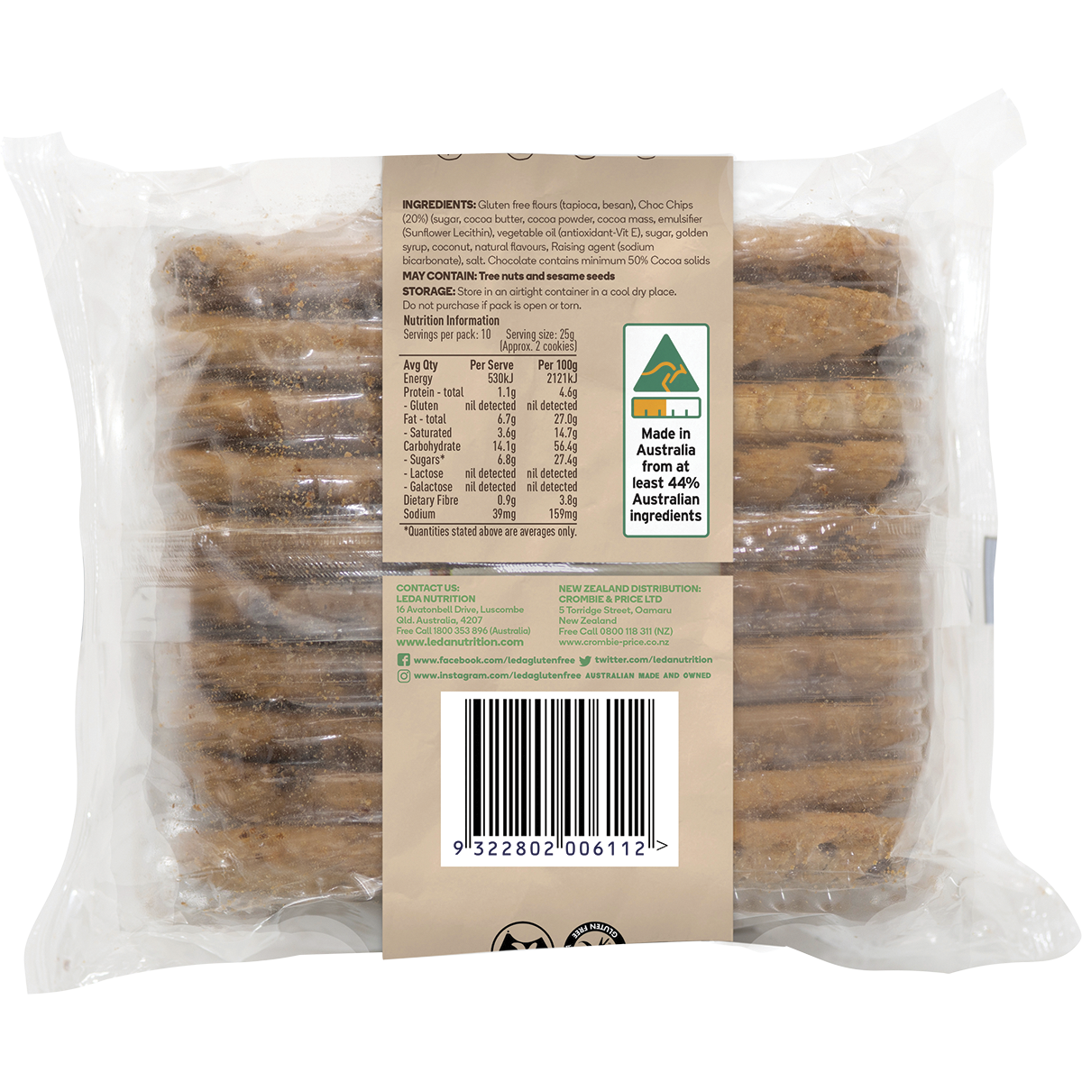 Gluten Free Flours (Tapioca, Besan), Dairy Free Choc Chips (20%) (Sugar, Cocoa Liquor, Cocoa Butter, Emulsifier (Soy Lecithin), Natural Vanilla Flavour), Vegetable Oil (Antioxidant - Vit E Soy), Sugar, Golden Syrup, Coconut, Natural Flavours, Raising Agent (Sodium Bicarbonate), Salt.