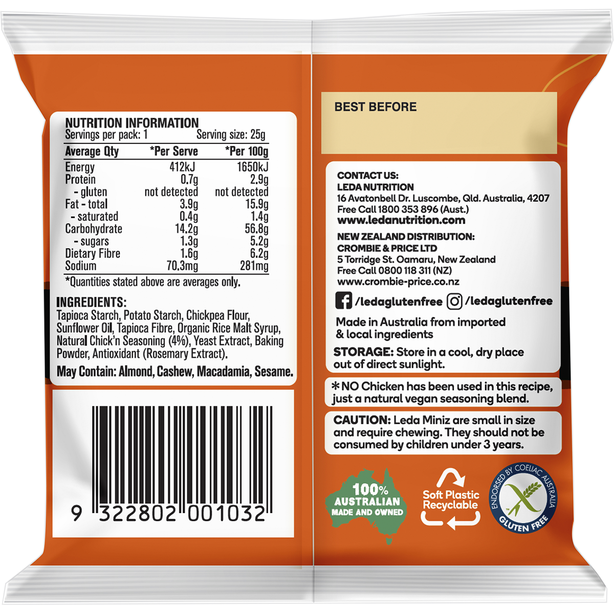 Discover the ultimate guilt-free snacking solution with the **Leda Cracker Miniz Chick'n Multi 6 Pack**. These irresistibly crunchy mini crackers deliver a savory, authentic 'Chick'n' flavour, perfect for satisfying those cravings any time of the day. This convenient bulk pack ensures you always have a healthy, delicious snack on hand, whether you're packing lunches, hosting guests, or just enjoying a moment of me-time. **Why choose Leda Cracker Miniz?** * **Perfectly Plant-Based:** Certified Vegan Friendly, making them suitable for everyone. * **Worry-Free Snacking:** Made with a blend of chickpea flour, potato, and tapioca starches, these crackers are certified Gluten-Free. * **Natural Ingredients:** Flavoured using Natural Chick'n Seasoning and enhanced with Rosemary Extract as a natural antioxidant. * **Great Value:** The 6-pack offers fantastic value, ensuring your pantry is stocked with 6 individual 150g packs. Enjoy them straight from the box, or pair them with your favourite dips or spreads. Experience the Leda difference—taste and quality without compromise.