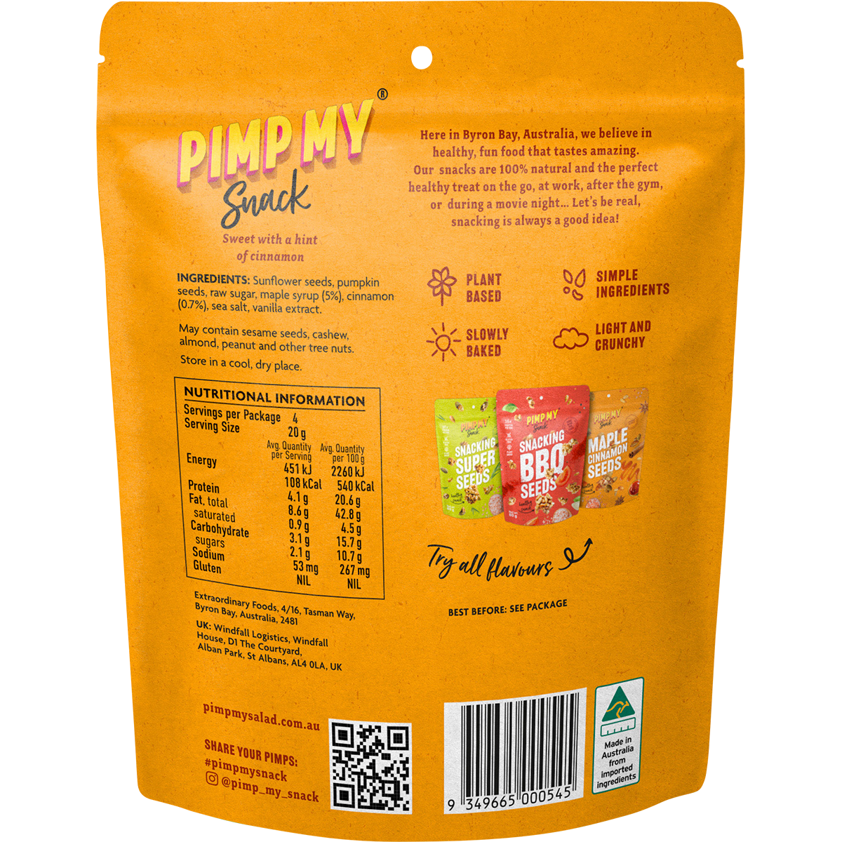 Indulge your taste buds with Pimp My Snack Maple Cinnamon Seeds, a delightful blend of sunflower and pumpkin seeds tossed in the rich flavours of maple syrup and cinnamon. This 80g pack offers a wholesome and satisfying snack for everyone—from busy professionals looking for a nutritious pick-me-up to families seeking a tasty treat for their little ones. With each crunchy bite, you’ll experience the perfect balance of sweet and savoury that makes snacking not just enjoyable, but also guilt-free.