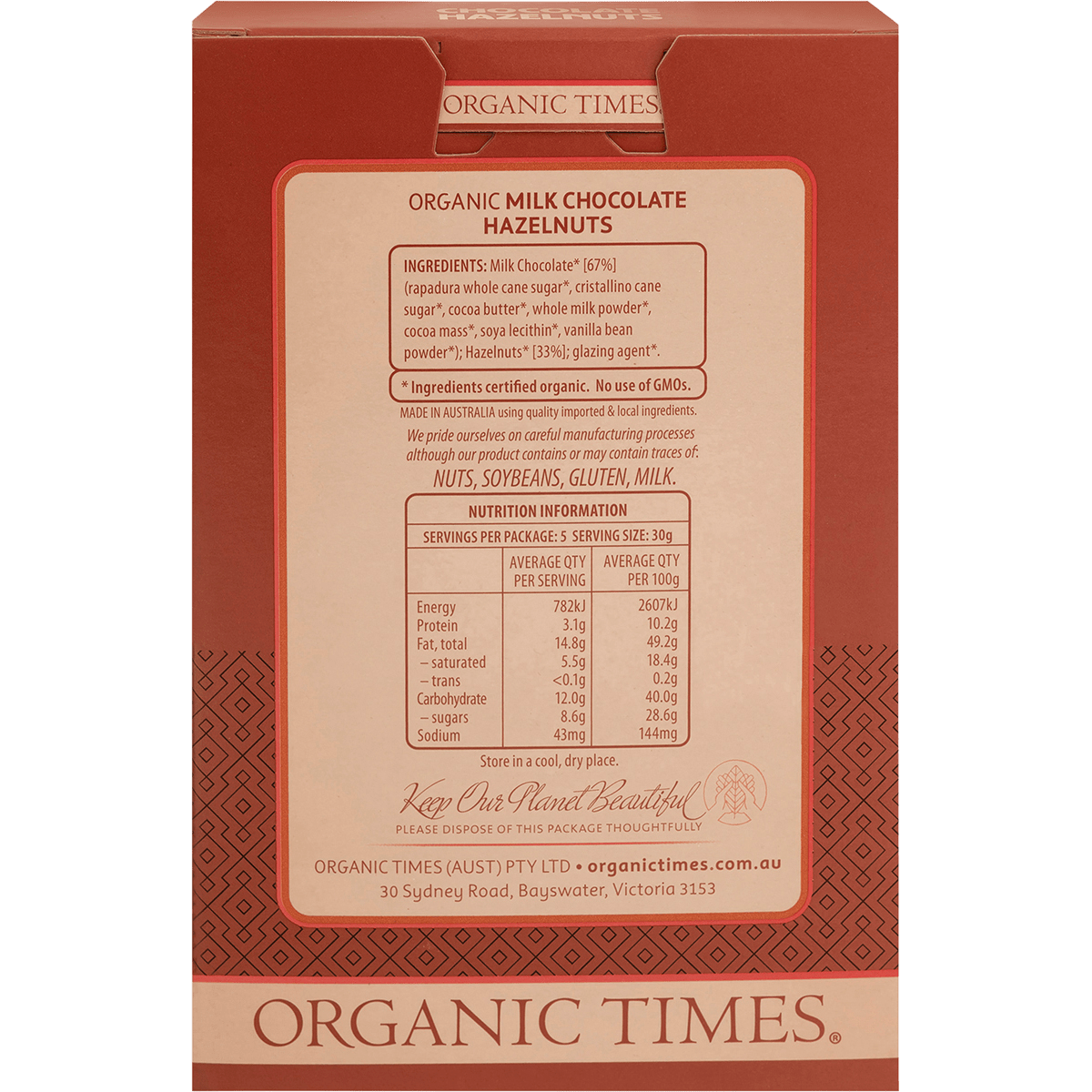 Crafted with care, our Organic Times Milk Chocolate Hazelnuts are made from high-quality, certified organic ingredients. The premium milk chocolate, made with a blend of whole cane and crystallino cane sugars, is not only delicious but also free from artificial additives. The combination of plant-based proteins and wholesome ingredients means that you can enjoy this treat knowing you’re making a thoughtful choice for your wellness. Plus, the balanced flavour profile, with hints of vanilla bean and a subtle nutty essence, creates a taste experience that is both sophisticated and comforting.