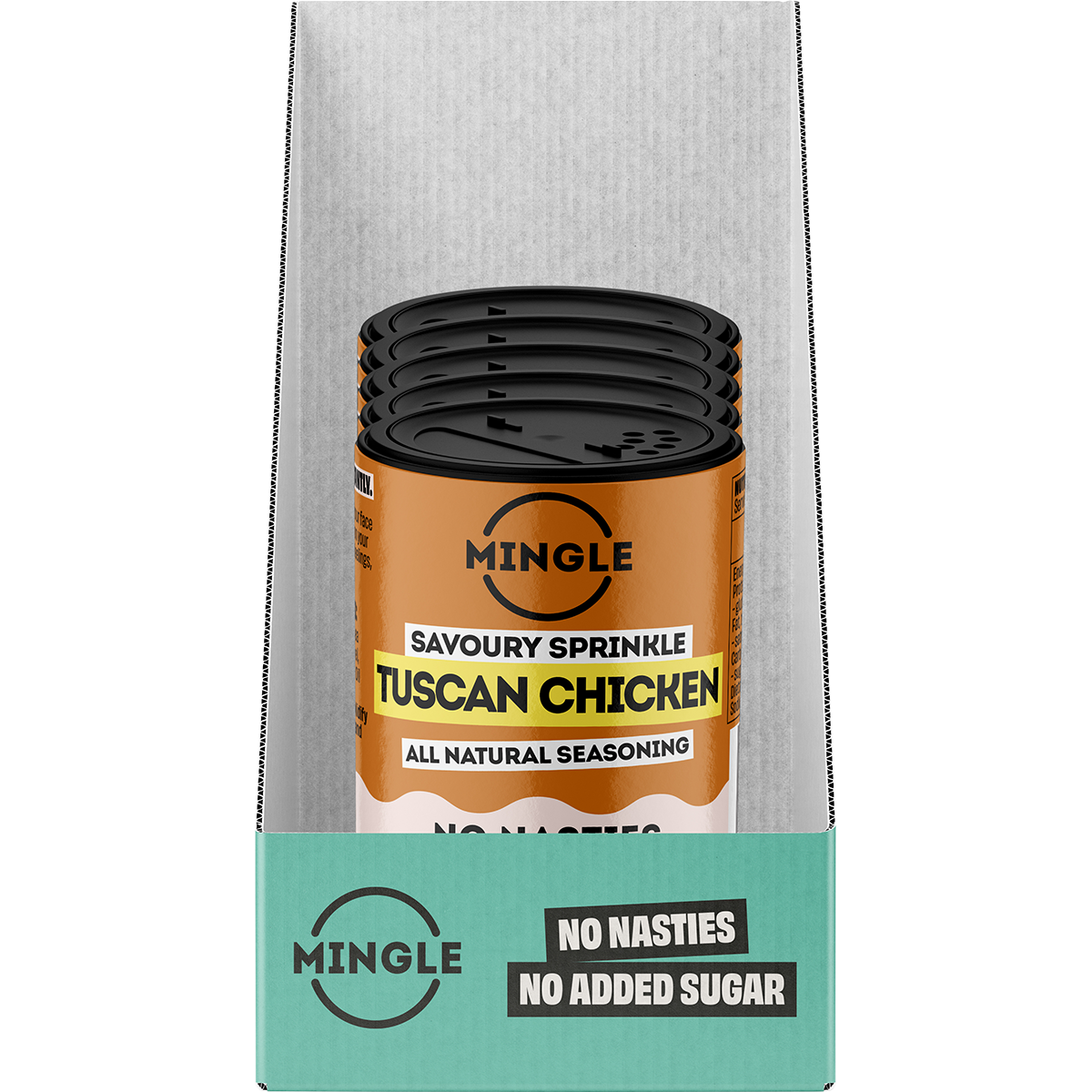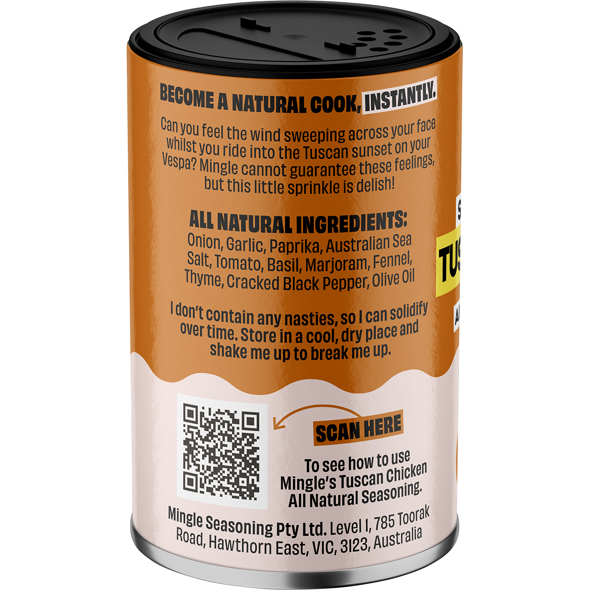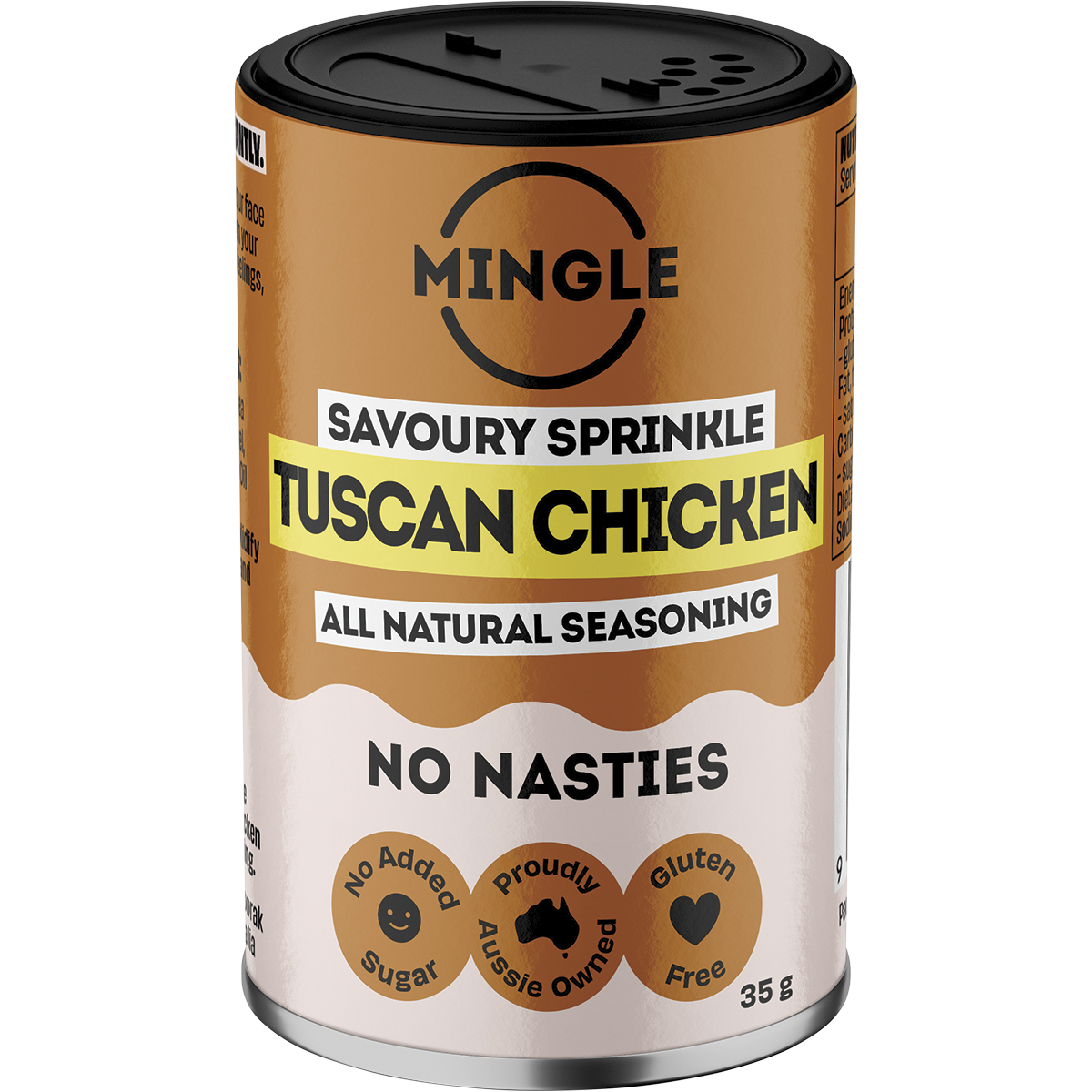 Mingle believes in flavor without compromise. Our Tuscan blend features a harmonious mix of premium, natural ingredients like <strong>Basil, Marjoram, Fennel, Thyme, Garlic, and Tomato</strong>, perfectly seasoned with Australian Sea Salt. You get rich, aromatic depth every time, free from artificial additives.
