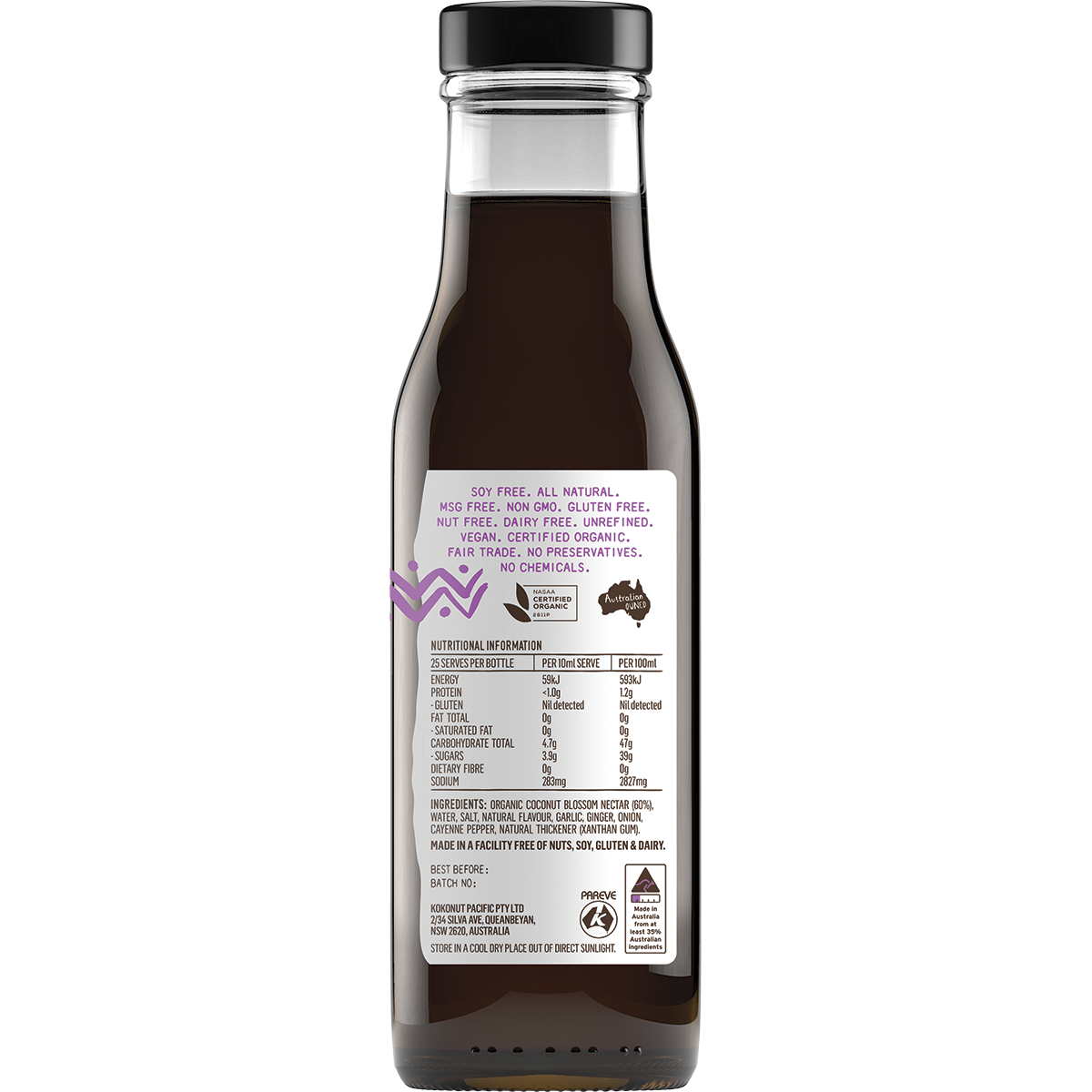 Ingredients: Organic Coconut Blossom Nectar (60%), Water, Salt, Natural Flavour, Garlic, Ginger, Onion, Cayenne Pepper, Natural Thickener (Xanthan Gum).