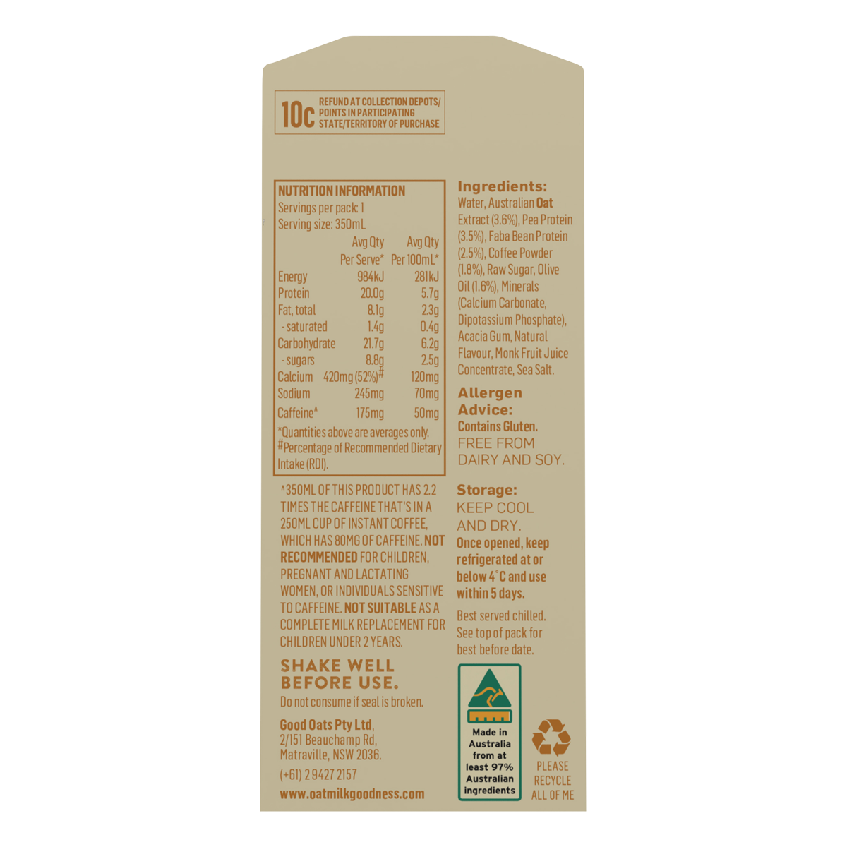 Water, Australian Oat Extract (3.6%), Pea Protein (3.5%), Faba Bean Protein (2.5%), Coffee Powder (1.8%), Raw Sugar, Olive Oil (1.6%), Minerals (Calcium Carbonate, Dipotassium Phosphate), Acacia Gum, Natural Flavour, Monk Fruit Juice Concentrate, Sea Salt.