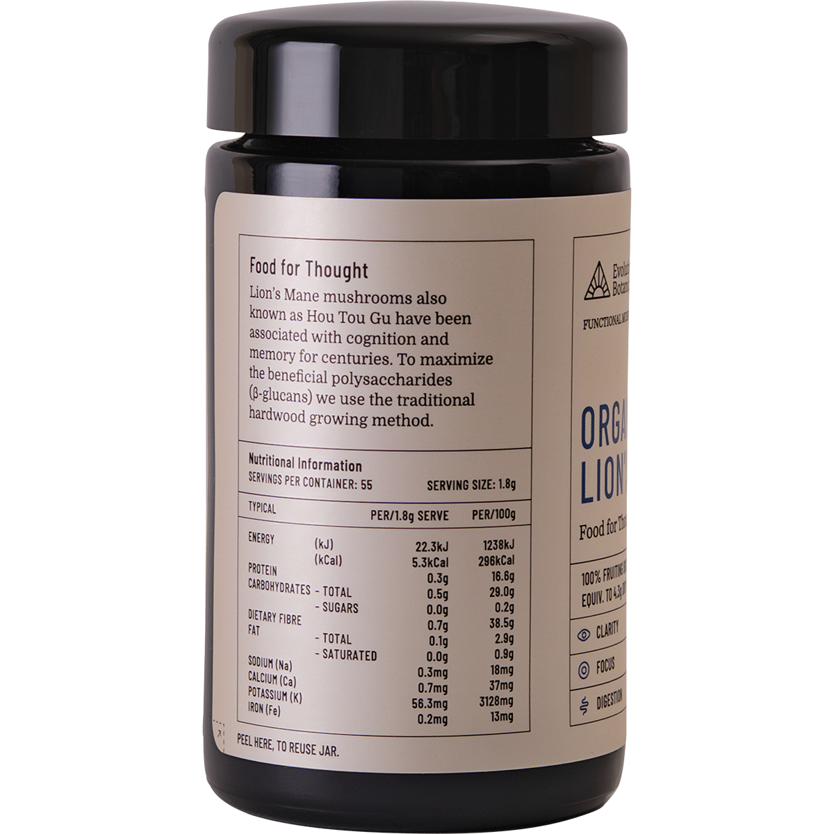 Elevate your wellness journey with Evolution Botanicals Organic Lion's Mane Food For Thought. This 200g jar of premium organic Lion's Mane mushroom powder is more than just a supplement; it's a delicious addition to your daily routine. Perfect for anyone seeking to enhance cognitive function, support mental clarity, and promote overall brain health, this product is designed for those who value the power of nature and the benefits of clean, plant-based nutrition.