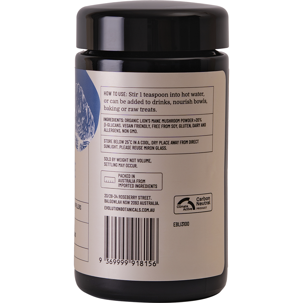 Crafted from high-quality organic Lion's Mane mushrooms, this powder boasts a rich, earthy flavour accented with subtle chocolate notes, making it a delightful addition to smoothies, coffee, or baked goods. With its smooth, fine texture, it easily blends into your favourite recipes, allowing you to enjoy its benefits without compromising on taste. Choose Evolution Botanicals for a product that prioritises purity and performance, ensuring that every scoop supports your wellness goals.