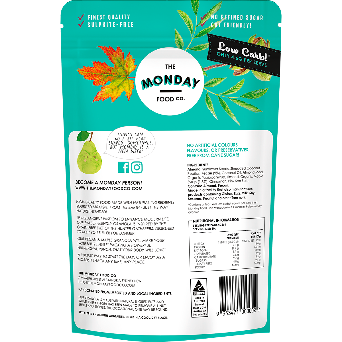 Indulge in the delightful crunch of The Monday Food Co. Paleo Gourmet Granola Pecan & Maple, a wholesome blend crafted for health-conscious snackers and breakfast lovers alike. This gourmet granola is a delicious way to kick-start your day or satisfy your mid-afternoon cravings. With its rich notes of maple and the satisfying crunch of pecans, it brings together the best of nature’s bounty in every bite. Perfect for those following a paleo lifestyle or anyone who values clean, nourishing ingredients, this granola is designed to fuel your body and delight your taste buds.