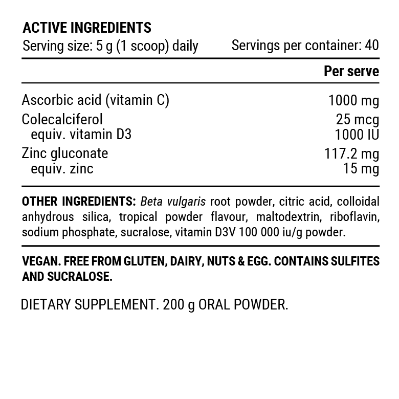 Mix one scoop (approx. 4g) of Pillar Performance Ultra Immune C Tropical with 200-250ml of cold water or your favorite beverage. Stir or shake well until dissolved. Consume once daily, preferably with a meal, or as directed by your healthcare professional. For optimal results, consistent daily use is recommended. Store in a cool, dry place away from direct sunlight.
