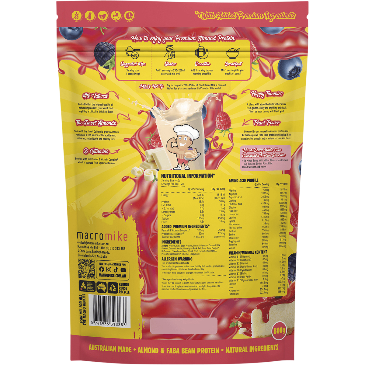 Indulge in a guilt-free treat with MACRO MIKE Premium Almond Protein Berry White Choc Cheezecake! This delicious protein powder is perfect for fitness enthusiasts and health-conscious individuals looking to elevate their nutrition while satisfying their sweet cravings. With its unique blend of almond and faba bean proteins, this delightful cheesecake flavour offers a wholesome way to fuel your body and delight your taste buds.