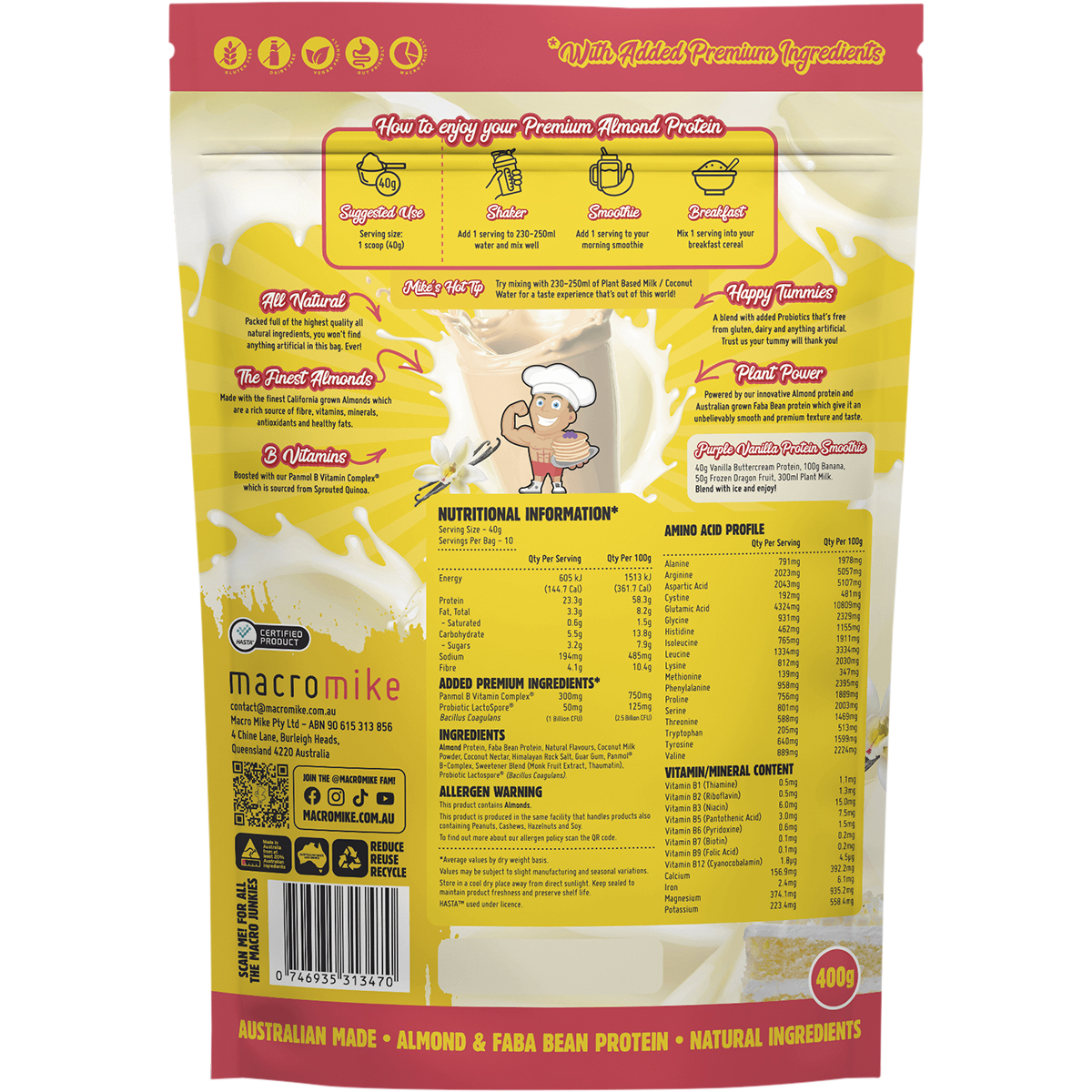 Indulge your taste buds while nourishing your body with MACRO MIKE Premium Almond Protein Vanilla Buttercream. This deliciously creamy protein blend is perfect for anyone seeking a wholesome and satisfying way to elevate their daily nutrition. Crafted from a unique combination of almond and faba bean protein, this plant-based delight is designed for fitness enthusiasts, health-conscious individuals, or anyone looking to enhance their diet with clean, organic ingredients. With its sweet vanilla buttercream flavour, it’s not just a protein supplement; it’s a treat you’ll look forward to every day!