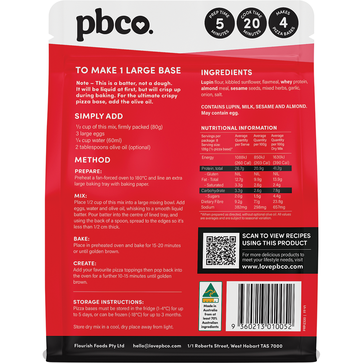 Crafted with plant proteins and wholesome ingredients, the PBco Protein Pizza Base is a guilt-free option that doesn't compromise on taste. The unique combination of lupin flour, kibbled sunflower, and almond meal creates a satisfying texture, while the aromatic herbs and spices elevate the flavour profile to a whole new level. It's not just about being healthy; it's about enjoying every bite! Perfect for those following a low-carb or high-protein diet, this pizza base allows you to indulge in your favourite toppings while keeping your nutritional goals in check.