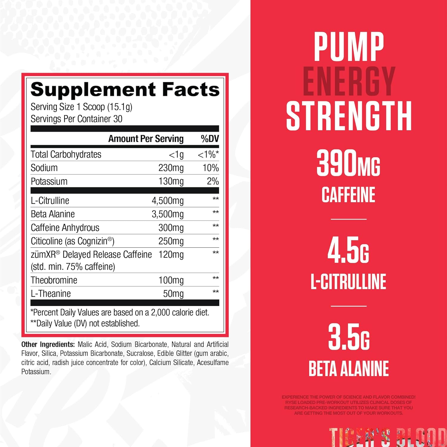 The RYSE Loaded Pre-Workout in the exotic Tiger's Blood flavor is formulated for athletes who demand peak performance from their training sessions. This is not just another high-stimulant product—it's a fully transparent, clinically-dosed powerhouse designed to deliver explosive pumps, razor-sharp cognitive focus, and sustained, intense energy.