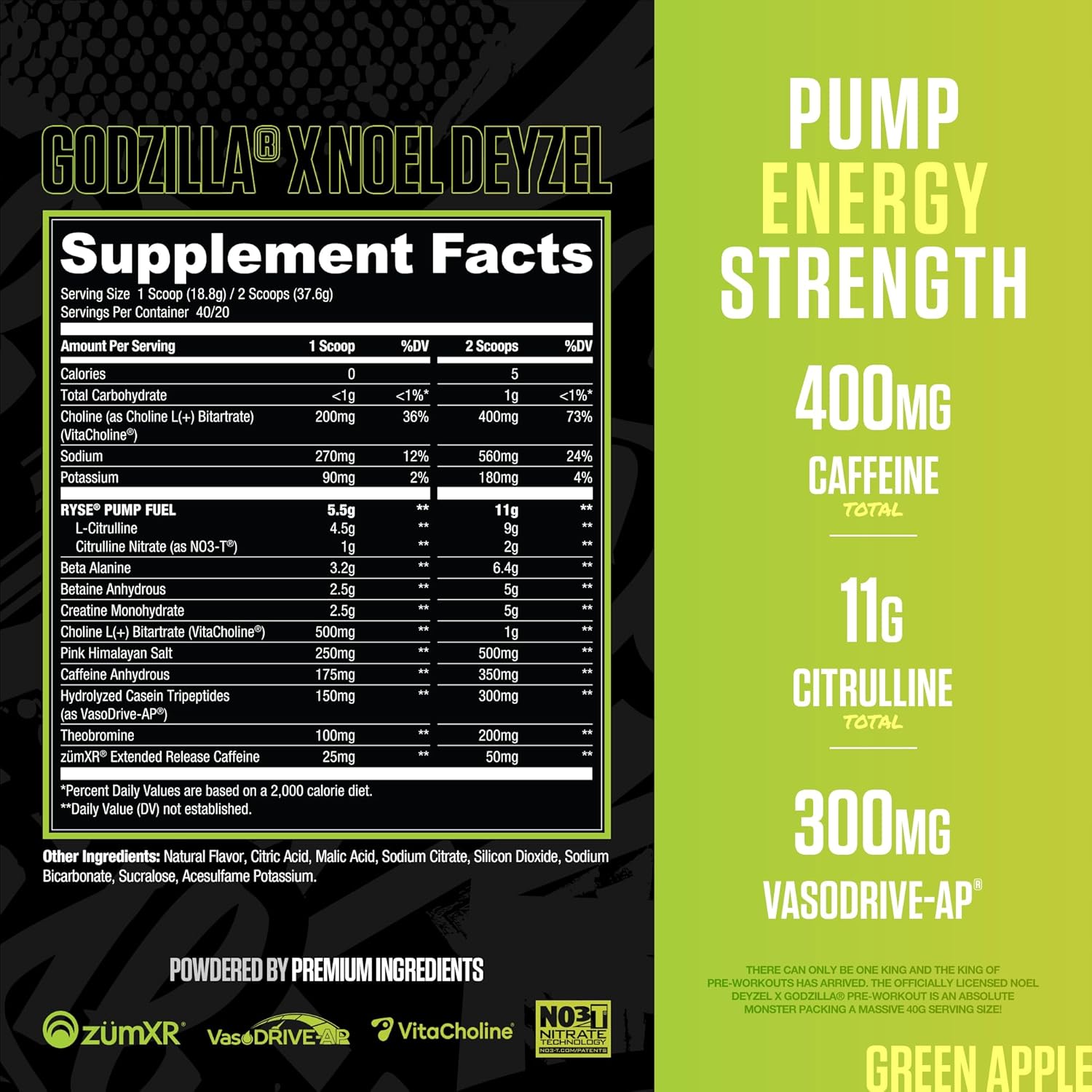 Mix one (1) massive scoop (40g) of Ryse Godzilla Pre-Workout with 10-12 oz of cold water 15-30 minutes before training. Due to the high potency and stimulant content, assess your tolerance by starting with a half scoop if necessary. Do not exceed one scoop in a 24-hour period.