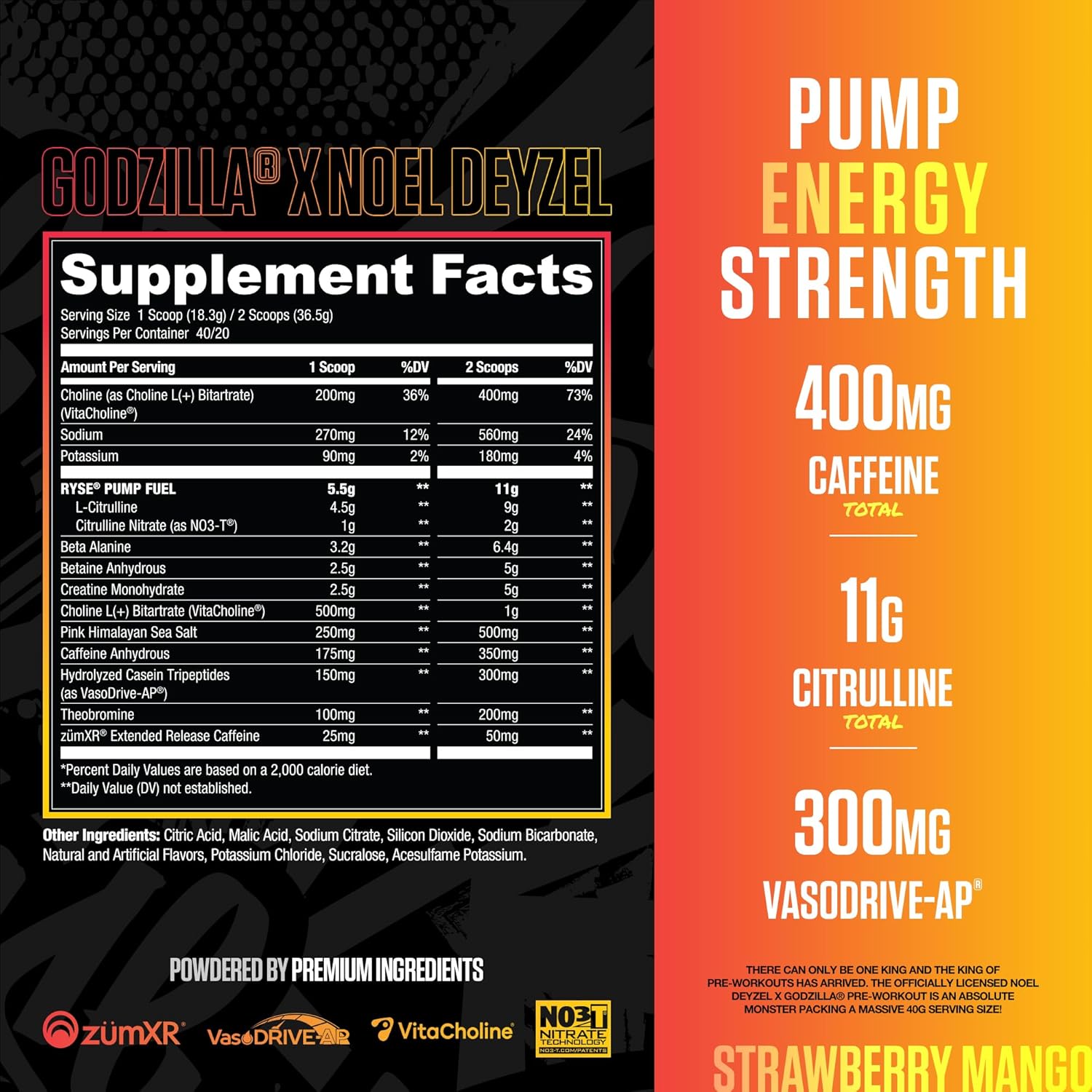 Prepare to unleash the beast within your gym session with the officially licensed Noel Deyzel X Godzilla® Pre-Workout from Ryse Supps. The Ryse Godzilla Pre-Workout in delicious Strawberry Mango flavor is not just a supplement; it's a massive 40g serving packed with clinically dosed ingredients designed to deliver city-crushing pumps, explosive energy, unparalleled strength, and laser-sharp focus.