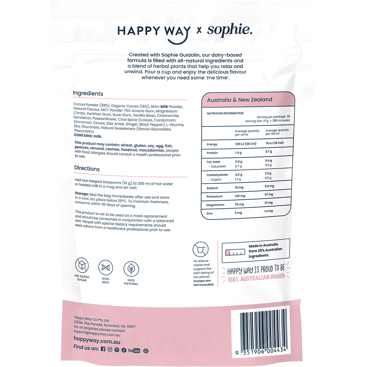 Perfect for health-conscious individuals and families alike, Happy Way Sophie's Hot Choccy is not just another hot chocolate; it's a thoughtfully curated blend that combines premium cocoa with organic ingredients like cacao and a mix of soothing herbs. With every sip, you’ll experience the delightful harmony of chocolate notes blended with aromatic spices, making it the ideal choice for anyone looking to enhance their wellness routine without sacrificing flavour.