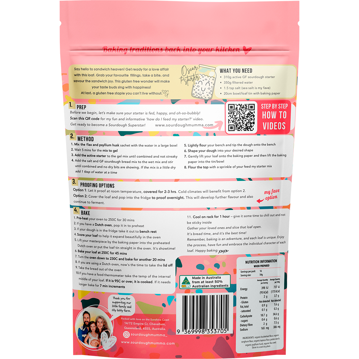 Made with a thoughtful combination of organic flours, including buckwheat and sorghum, this sourdough bread mix is designed to deliver a rich, satisfying flavour profile with every bite. The inclusion of psyllium husk not only supports the bread's structure but also enhances its digestibility, making it a truly enjoyable experience for both your taste buds and your gut. Say goodbye to store-bought gluten-free bread that lacks flavour and texture; Sourdough Mumma is here to elevate your baking game!