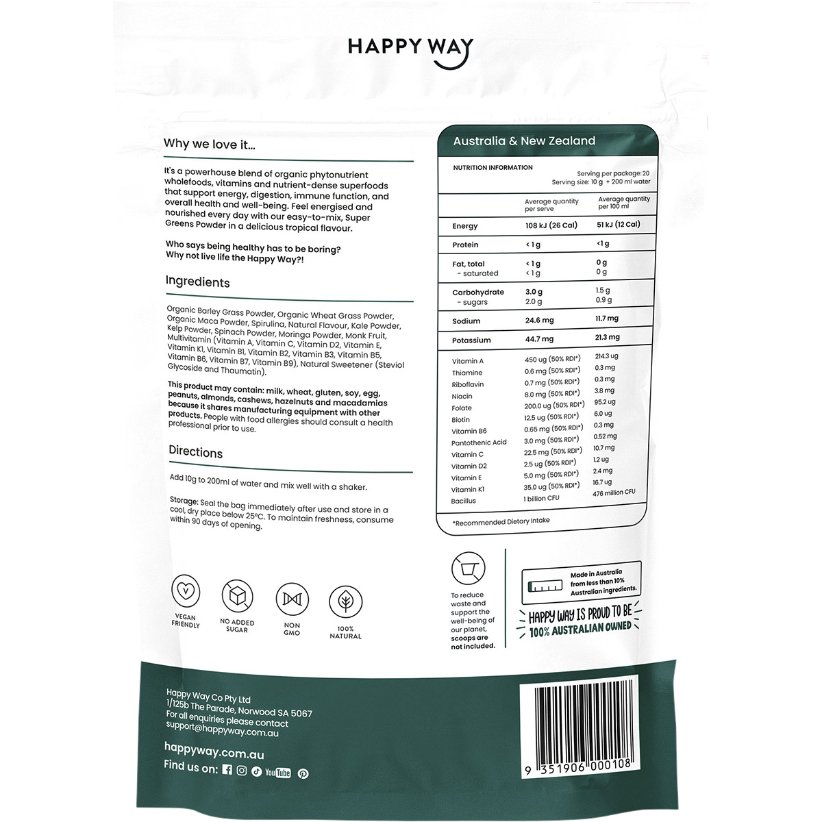 Discover the vibrant health benefits of Happy Way Super Greens Powder Tropical! This delicious blend is designed for health enthusiasts, busy professionals, and anyone looking to elevate their daily nutrition. Packed with organic ingredients, this super greens powder offers a convenient way to incorporate essential vitamins and nutrients into your lifestyle without sacrificing taste. Each scoop features a refreshing tropical flavour that transforms your smoothies, juices, or even your morning oatmeal into a nutrient-rich delight.