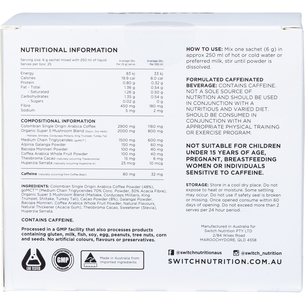 Mix 1 sachet (25 serves per pack) with 250ml of hot or cold water, or your preferred milk/milk substitute. Stir well until dissolved. Consume in the morning or early afternoon when intense focus is required. Do not exceed the recommended daily serving.