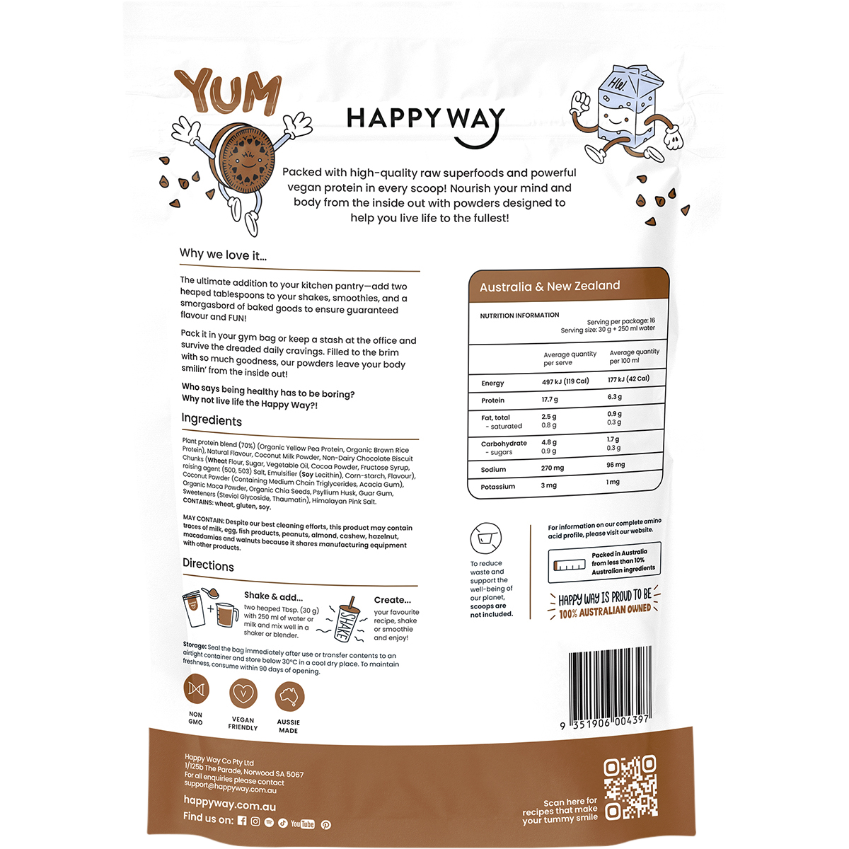 Crafted with a powerful plant protein blend, Happy Way Vegan Protein Powder is made from organic yellow pea protein and organic brown rice protein, providing a complete amino acid profile. Each scoop is not only packed with protein but also features delightful non-dairy chocolate biscuit chunks that create a genuinely indulgent taste experience. With the added benefits of coconut milk powder, organic maca powder, and chia seeds, this protein powder supports your wellness goals without compromising on flavour or quality.