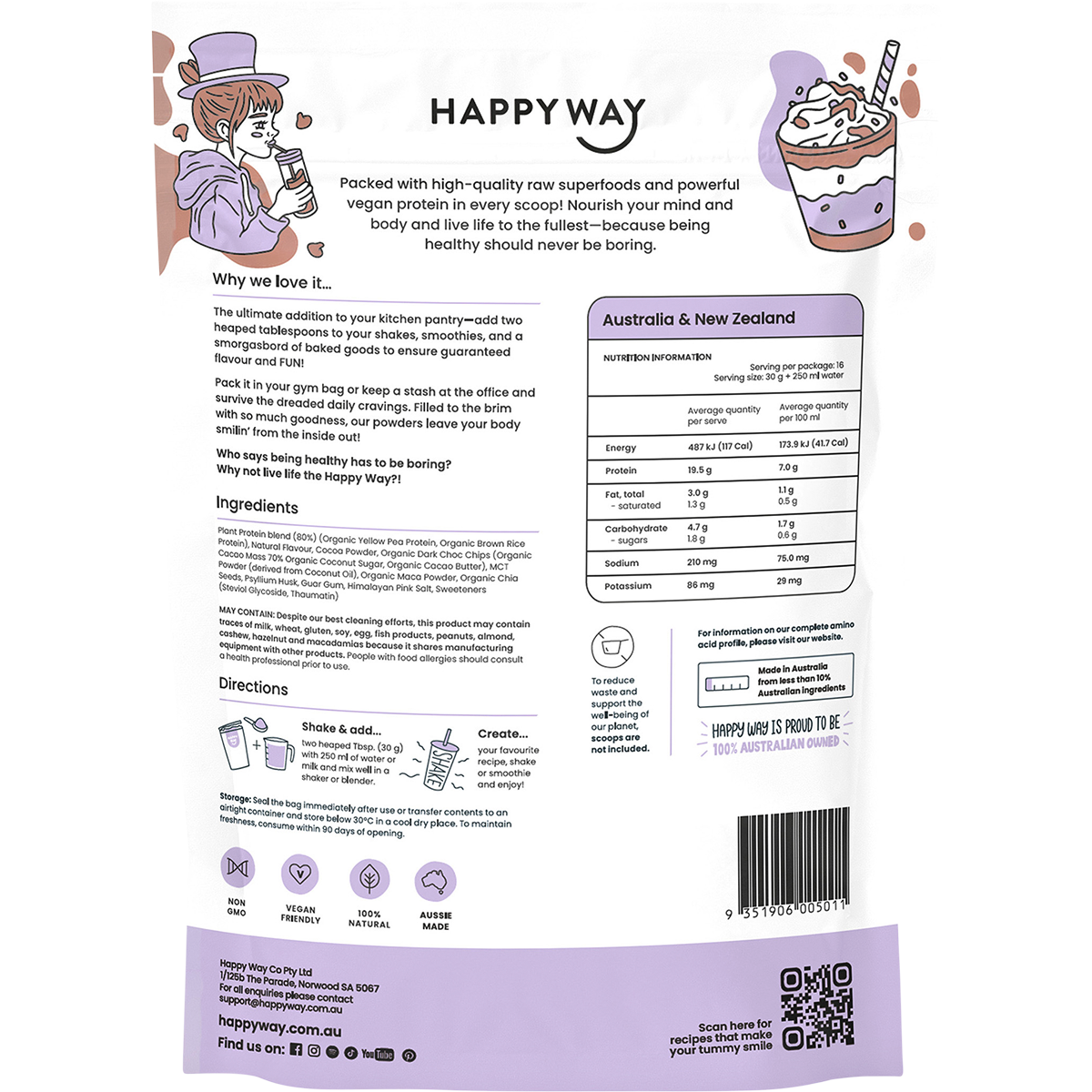 Discover the deliciously satisfying Happy Way Vegan Protein Powder in Double Choc Chip flavour! This premium protein blend is crafted for those who appreciate the power of plant-based nutrition without compromising on taste. Whether you're an athlete seeking to enhance muscle recovery, a busy professional looking for a nutritious snack, or simply someone who wants to incorporate more wholesome ingredients into their diet, Happy Way Vegan Protein Powder is your perfect companion.