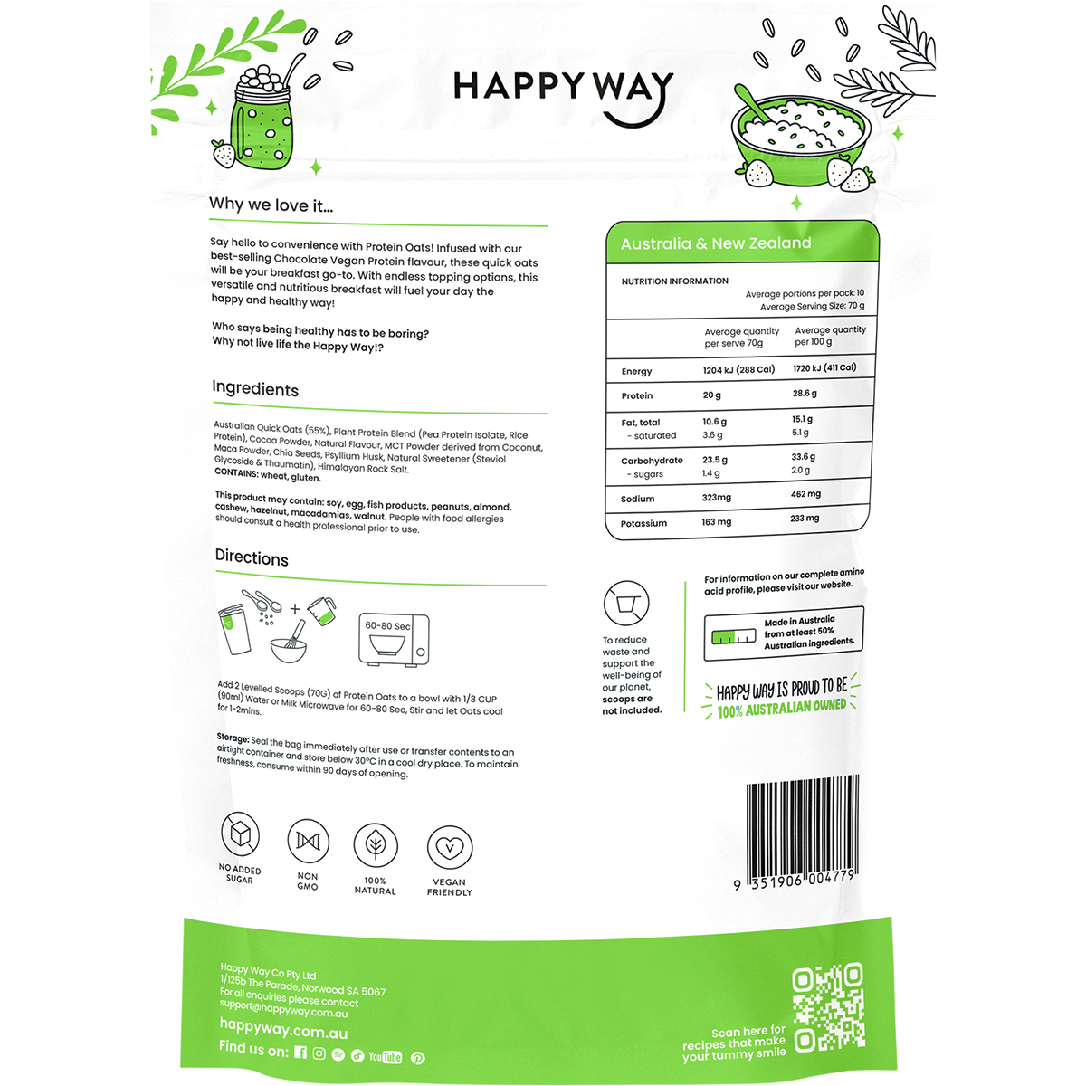Dive into a delightful and nutritious experience with Happy Way Vegan Protein Quick Oats in Chocolate flavour! Designed for health-conscious individuals, this product combines the wholesome goodness of Australian quick oats with a rich blend of plant-based proteins. It’s perfect for anyone looking to elevate their breakfast game or power through a busy day with a quick, satisfying meal. Whether you're a fitness enthusiast, a busy professional, or simply someone who enjoys delicious food, these quick oats are a fantastic option for nourishing your body with clean and energising ingredients.