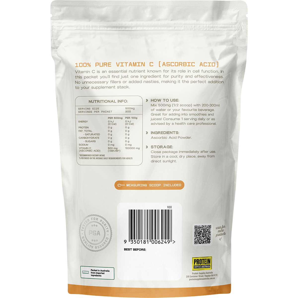 Choosing Protein Supplies Australia means opting for quality you can trust. Our Vitamin C Unflavoured Powder is made from the highest quality ascorbic acid, ensuring maximum potency without compromising on purity. With no added sugars or artificial ingredients, you can feel confident knowing you’re nourishing your body with only the essentials. The fine powder blends seamlessly into smoothies, juices, or even your favourite recipes, making it an effortless addition to your daily routine.