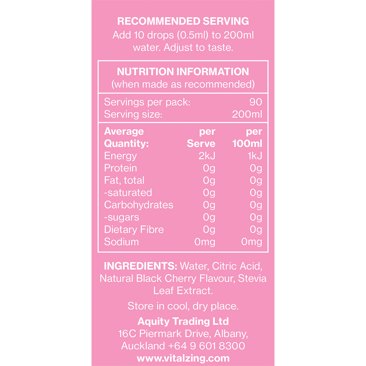 Crafted with care, these drops feature a blend of natural black cherry flavour and a touch of stevia leaf extract, ensuring that each drop brings you a delightful taste without the guilt. Ideal for anyone seeking a healthier alternative to sugary drinks, Vital Zing Water Drops are perfect for those who want to quench their thirst while indulging in the rich, fruity flavour of black cherry. With just a few drops, you can turn your water into a refreshing treat that keeps you feeling energised and hydrated throughout the day.