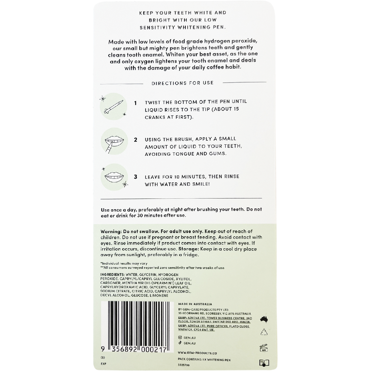 Why choose the Gem Whitening Pen? It's all about convenience, taste, and results. This easy-to-use pen fits perfectly in your pocket or purse, allowing you to whiten your teeth anytime, anywhere. Its carefully selected ingredients work harmoniously to brighten your smile while keeping it healthy and fresh, making it an ideal choice for health-conscious consumers.