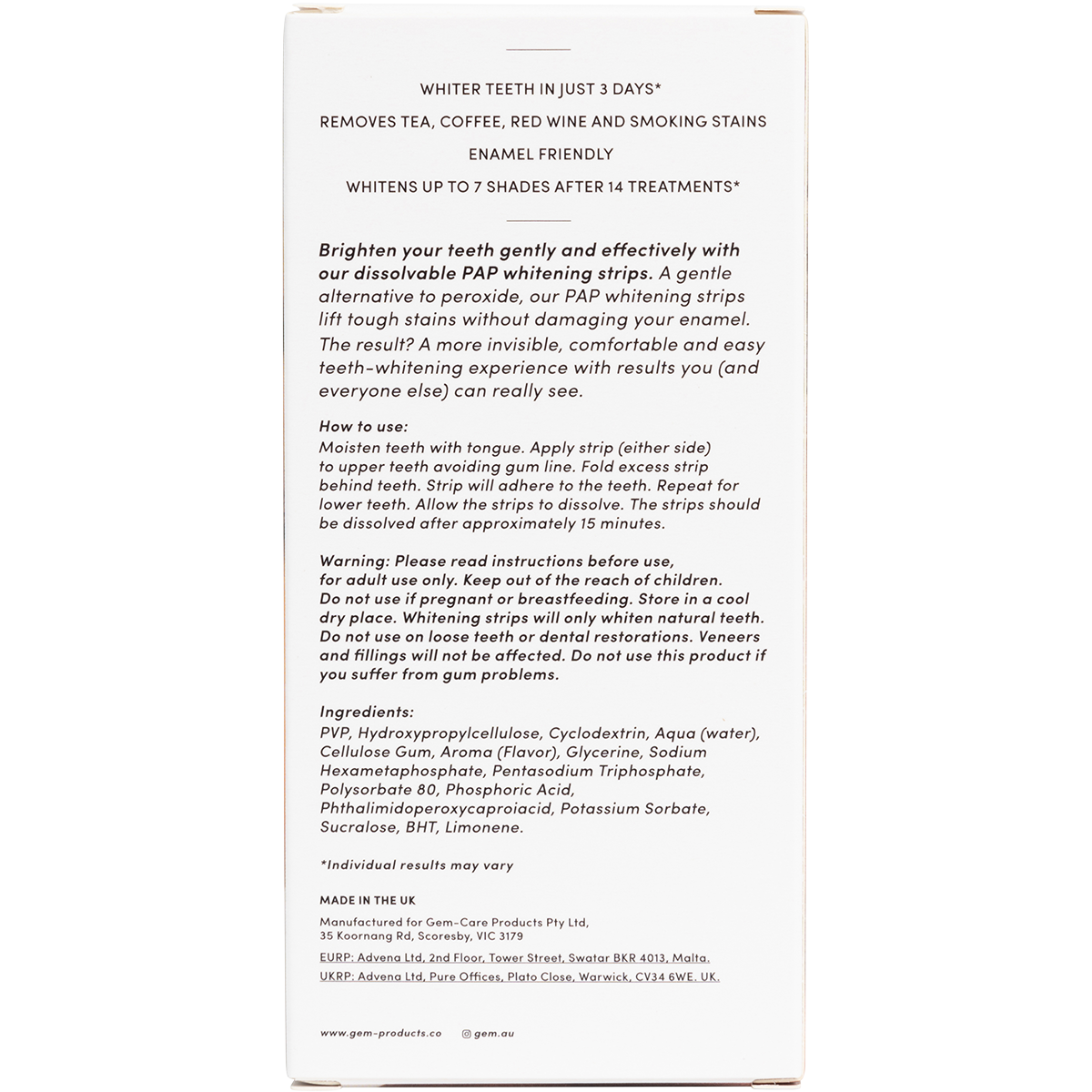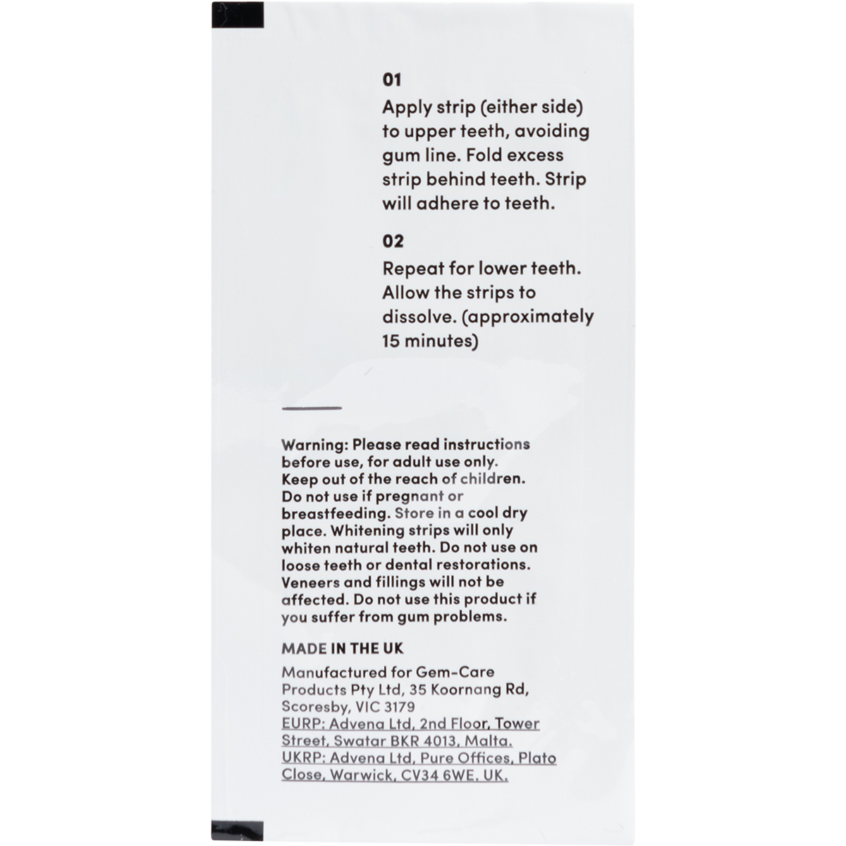 Gem Whitening Strips are perfect for anyone seeking a clean, easy-to-use whitening option without the hassle of complicated procedures. Each strip is infused with a unique blend of ingredients that work together to brighten your smile while ensuring a pleasant experience. Choose Gem for a whitening solution that not only works effectively but also feels good and tastes great!